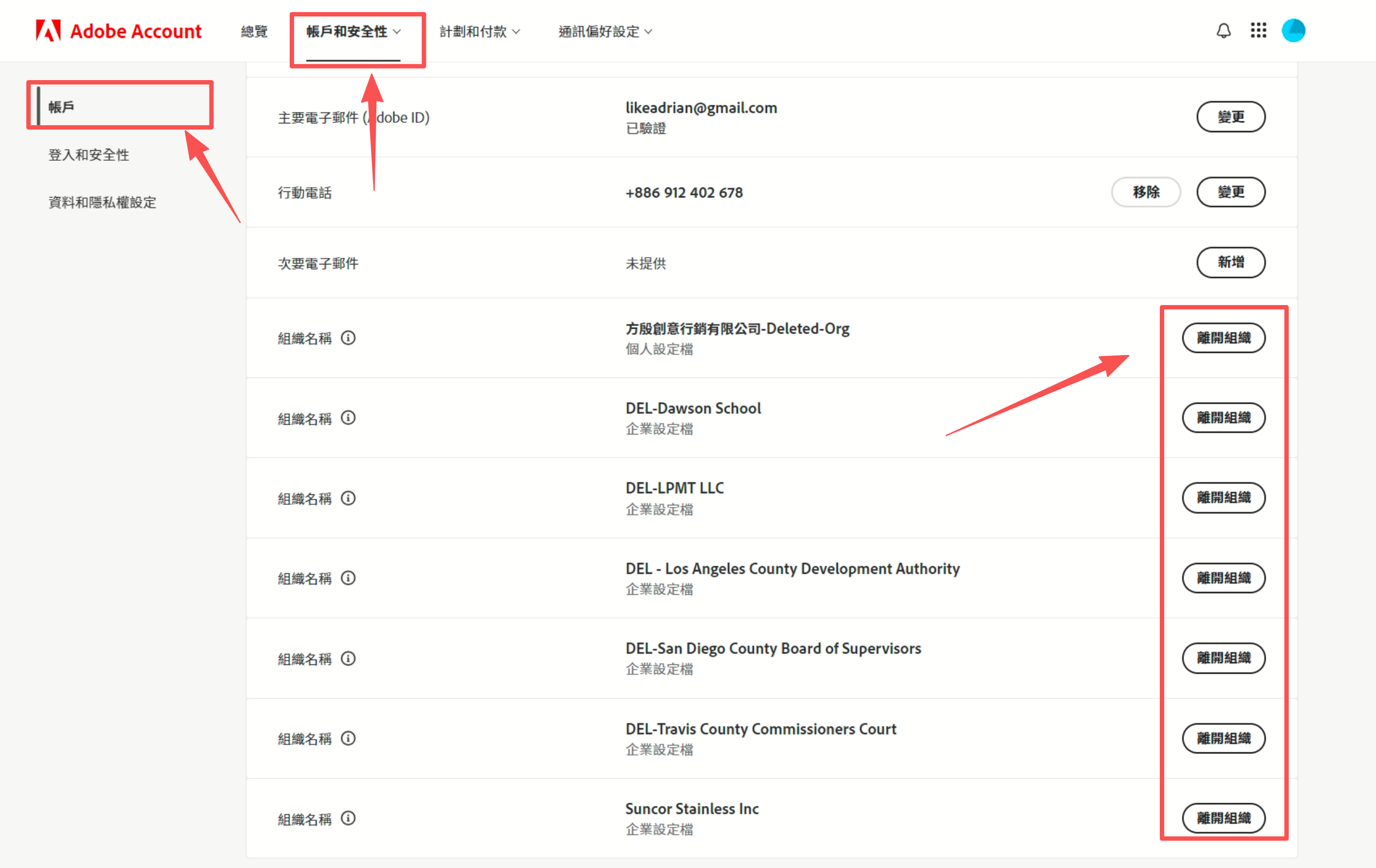 1、打開https://account.adobe.com/,登錄賬號,點擊右上角頭像,點擊切換至個人設定檔。再點擊編輯個人資料, 2、點擊賬戶與安全→賬戶,則可看到之前的失效組織,點擊離開組織,進入頁面後點擊確認離開即可。反復操作,將舊組織全部離開。(切記不要離開現有授權的組織)!